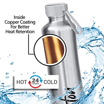 Inner copper coating for better temperature retention. Double walled Vacuum insulated technology keeps beverages hot or cold for 24 hours. This reusable water bottle is made from 304 Grade stainless steel, leak proof, durable, unbreakable, rust proof