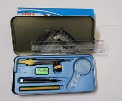 A ruler, a compass, a protractor, set squares, roller scales, pen and a divider