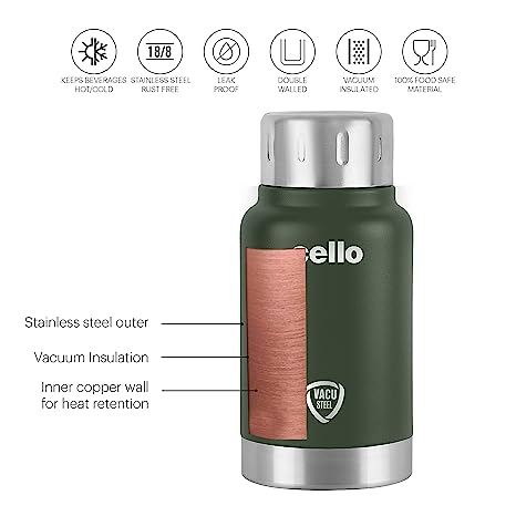 Inner copper coating for better temperature retention. Vacuum insulated technology keeps beverages hot or cold for long hours. The drink's flavours and nutritional content are unaltered. resulting in the container being a very suitable option for keeping beverages.