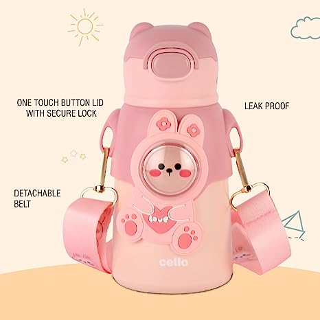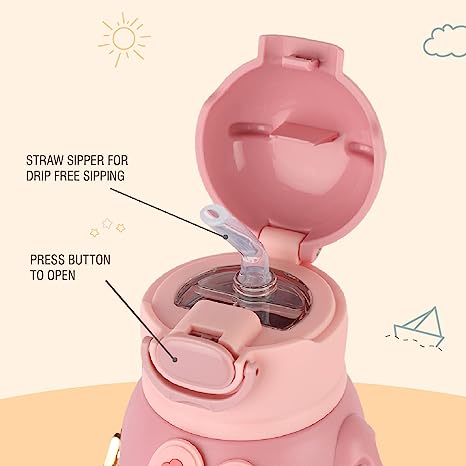 - The bottle comes with an easy-to use push button along with straw sipper for drip free sipping and a adjustable neck strap for easy portability.It is portable and lightweight. It easily fits in lunchboxes or backpacks.This water bottle is safe because it was made of non-toxic materials, protecting your child's health and wellbeing.