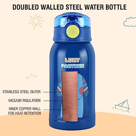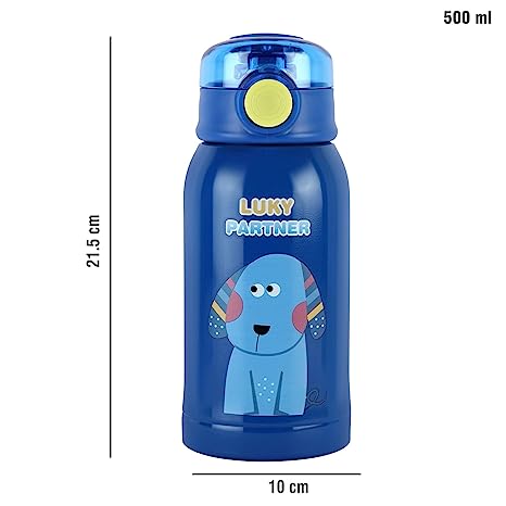 Kinder vacusteel flask is now a hydration buddy for your kids with attractive cartoon prints which they can carry to school , sports, picnics and other activities with ease. Cartoon Design: For children, drinking water is made enjoyable and enticing by using adorable and vibrant cartoon characters. Material: Stainless steel inside and plastic outside,Capacity- 500ml, Colour- Blue