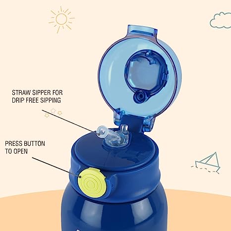 The bottle comes with an easy-to use push button along with straw sipper for drip free sipping and a adjustable neck strap for easy portability.It is portable and lightweight. It easily fits in lunchboxes or backpacks.This water bottle is safe because it was made of non-toxic materials, protecting your child's health and wellbeing.