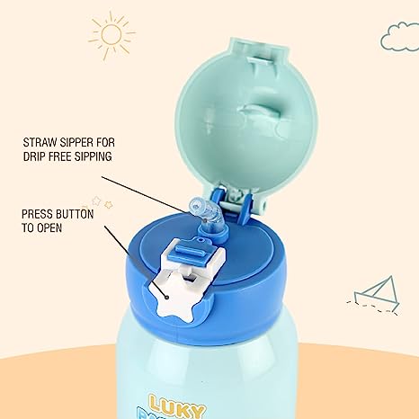 - Lucky Vacusteel flask is made of high-quality stainless steel used in the construction of this item ensures its durability and long-lasting use.Securely sealed to avoid leaks and spills, ensuring parental piece of mind and mess-free activities for children.Our children's cartoon water bottles have adorable, eye-catching patterns that will appeal to kids.