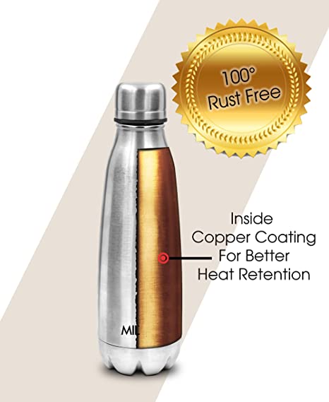 Double walled vacuum insulated stainless steel water bottle keeps beverages hot and cold for 24 hours. Inside copper coating for better heat retention