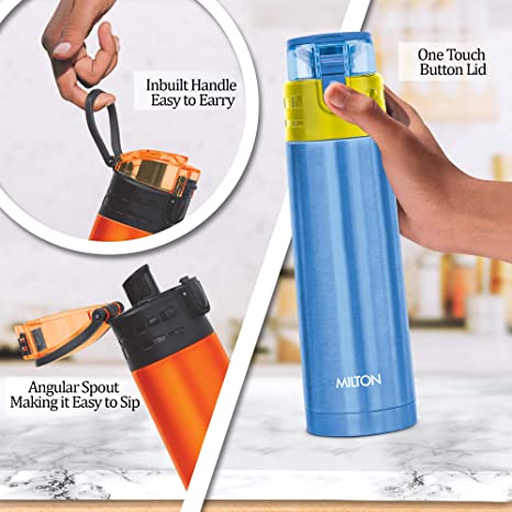Lid with one touch button to open, Angular spout, easy to sip. This bottle is comfortable to hold in hand. Ideal for gifting to kids, family and friends and also during occasions