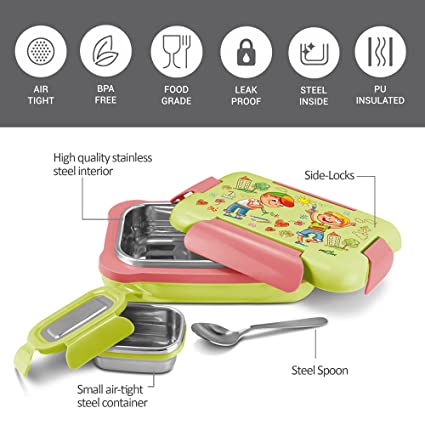 MILTON More Meal Insulated Inner Stainless Steel Small Tiffin Box, 600 ml, with Inner Stainless Steel Container, 120 ml and Spoon, Parrot Green | Food Grade | Easy to Carry | Easy to Clean