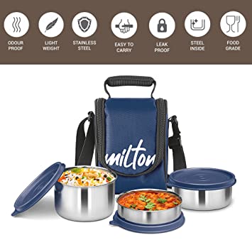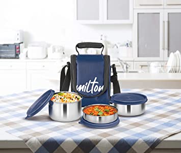 Material type: Stainless Steel; No. of containers: 3; Capacity of containers: 200 ml, 320 ml, 500 ml; Contents include: Tasty Lunch Box(3 Containers); Colour: Blue