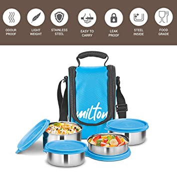 Material type: Stainless Steel; No. of containers: 4; Capacity of containers: 200 ml, 320 ml, 320 ml, 500 ml; Contents include: Tasty Lunch Box(4 Containers); Colour: Cyan